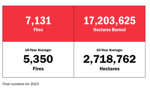In Kanada befinden sich 9% der Waldflächen der Erde. Jährliche Waldbrände sind eine "normale" Erscheinung, aber nicht in der Heftigkeit wie 2023. Details liefert hierzu das CANADIAN INTERAGENCY FOREST FIRE CENTRE (CIFFC).